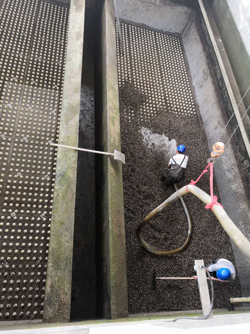 為了確保市民用上更加潔凈、優(yōu)質(zhì)的自來水,近日,公司對三水廠12格V型濾池石英砂濾料進行全部更換。